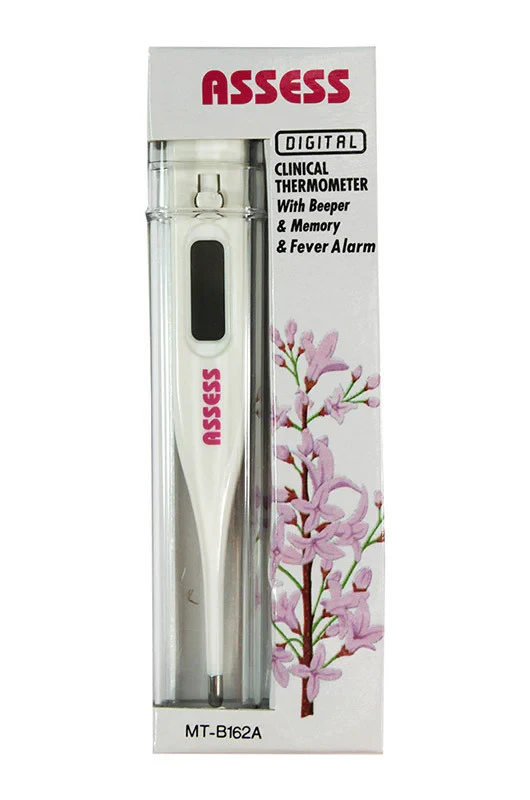 The Assess Digital Thermometer has a beeper to alert if there is fever, plus memory and an alarm. It measures from 32 to 42 degrees Celcius.