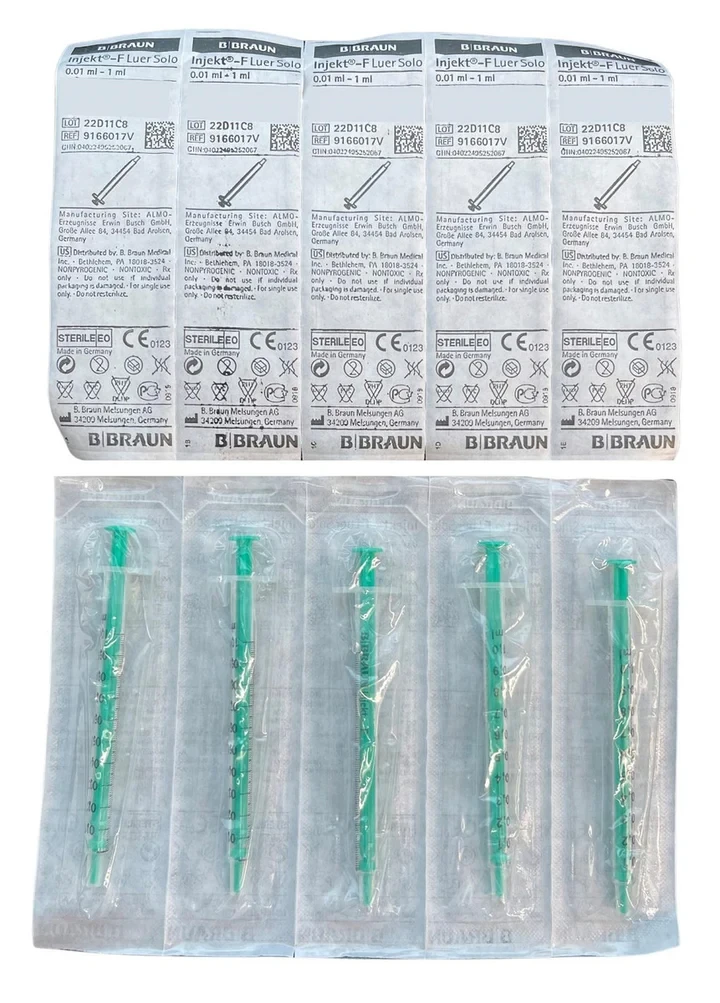 BBraun Injekt-F fine dosing syringe without cannulaFine dosing syringe for tuberculin/heparin/allergy testsLuer connector according to EN ISO 7886-1Polypropylene barrel, polyethylene plungerhighly transparent cylinder with green piston rod, smudge-proof black graduationsafe butt stop for problem-free winding up to the maximum volume; with saving mandrel, without dead space, no loss of medicationDisposable syringe PVC-free, latex-free, silicone oil-freeSize 1ml, scale value 0.01ml; centric coneDelivery 100 pieces in a dispenser box, syringes individually sterile packed
