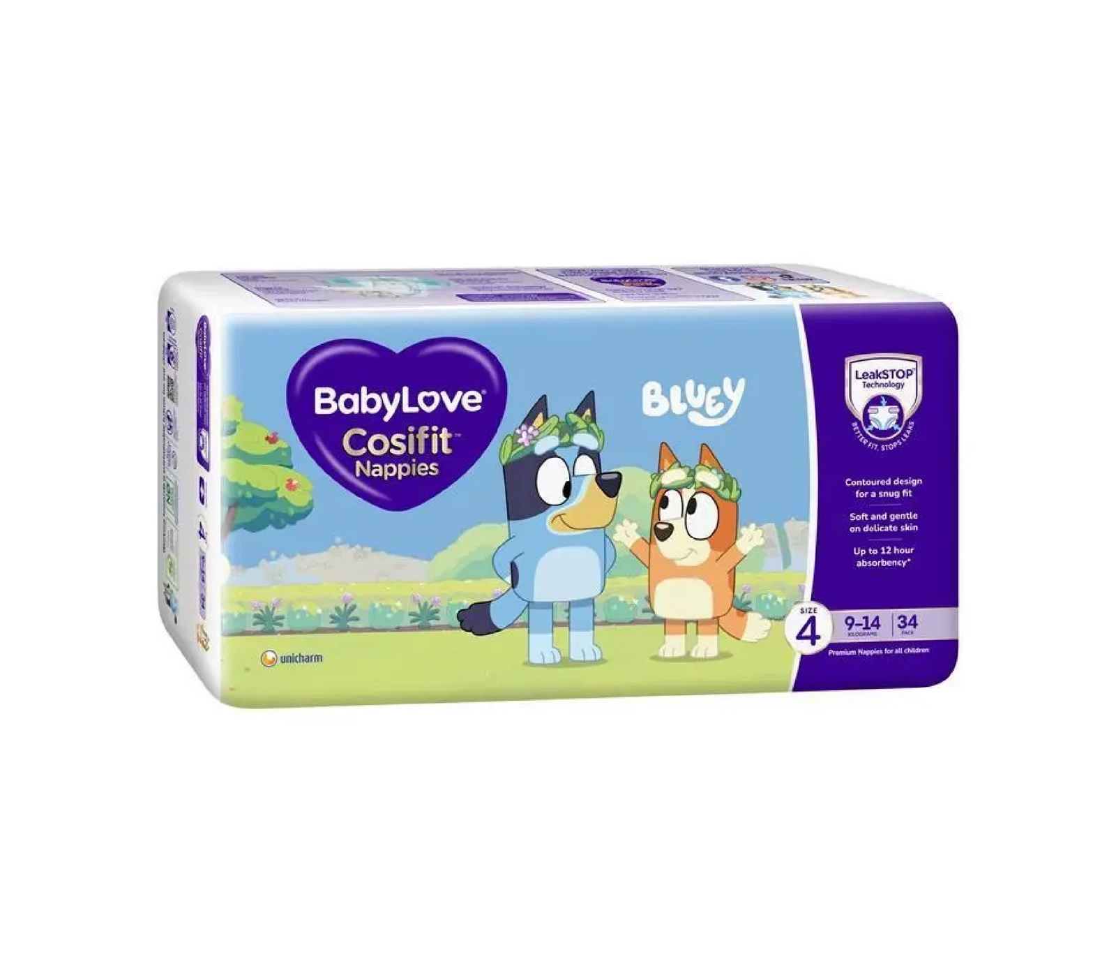 Stop leaks and keep your toddler comfortable day and night with BabyLove Cosifit Nappies! These size 4 nappies are designed for toddlers weighing between 9-14kg and come in a convenient bulk pack of 102 (3 packs of 34).LeakSTOP Technology with a unique hourglass shape provides a snug, contoured fit that prevents leaks. Double leg gathers with patented Cosifit Technology gently hug your baby’s legs to prevent Cosifit Nappies Size 4: Leak Protection and Comfort for Toddlers (9-14kg)Stop leaks and keep your toddler comfortable day and night with BabyLove Cosifit Nappies! These size 4 nappies are designed for toddlers weighing between 9-14kg and come in a convenient single pack of 34.LeakSTOP Technology with a unique hourglass shape provides a snug, contoured fit that prevents leaks. Double leg gathers with patented Cosifit Technology gently hug your baby’s legs to prevent leaks and red marks on their delicate skin.DriWave Technology keeps your toddler dry and comfortable for up to 12 hours, while the soft and breathable cover allows air to circulate for added comfort. The absorbent pad runs the entire length of the nappy for reliable leak protection and is suitable for both boys and girls.Plus, you can feel good knowing BabyLove Cosifit Nappies are made with sustainability in mind. They are PEFC certified, meaning the materials are sourced from 100% sustainably managed forests.Give your toddler the ultimate comfort and leak protection with BabyLove Cosifit Nappies!