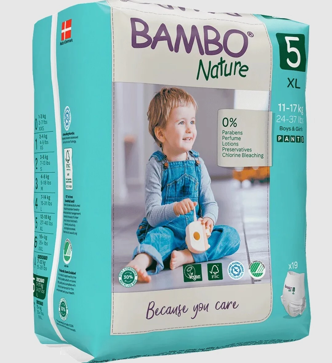 Help your toddler learn to go to the toilet independently, with the best and safest eco training pants in Australia. Bambo Nature eco pants are designed to protect sensitive skin and reduce the risk of allergies and nappy rash. The super absorbent core uses the latest channel technology to lead moisture away from toddlers’ skin to keep it drier. These pants help keep night time accidents in check, and will help your child sleep well at night. These training pants are slim and oh so soft against toddlers’ skin, and they’re free from parabens, phthalates, perfumes, lotions, preservatives, petrochemicals, alcohol, hydantoin, triclosan, bleach and other nasties. There’s a wetness indicator that changes colour so you know when it’s time for a change. The elasticated sides are strong and soft, and the flexible waistband and latex free cuffs keep the pants comfortably and snuggly in place. Bambo Nature eco pants hold not one, but two independent eco labels: the Nordic Swan Eco Label and the EU Ecolabel. Both of these are your guarantee of a lower eco footprint. This means a state-of-the-art manufacturing process, and the raw materials used in the pull ups have minimal environmental impact and low waste.Why we love Bambo Nature eco pull ups:Nordic Swan Eco Label EU EcolabelFSC certified wood pulpAsthma Allergy Nordic certifiedDermatologically testedno perfumes or other nastiesless chance of nappy rashfully recyclable, sustainable sugar cane packagingMade in Denmark.Size: 5 Packs of 19 training pants – carton of 95 pantsWeight range: 12 to 18kgs