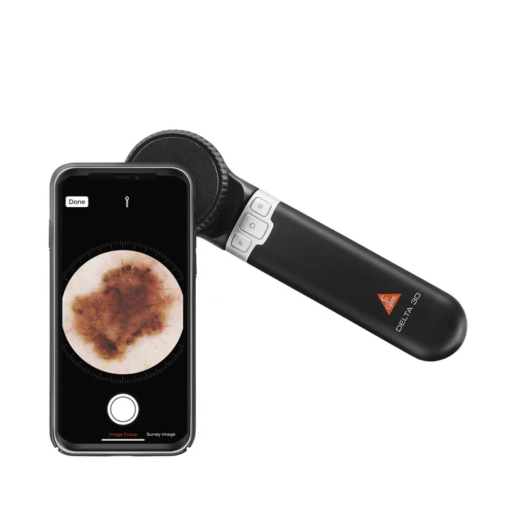 The HEINE DELTA 30 Dermatoscope is a high-end dermatological instrument known for its superior image quality and ergonomic design. It features a large 30mm field of view, 10x magnification, and an achromatic optical system for sharp. It offers both polarized and non-polarized illumination, with adjustable brightness levels and an autoclavable contact plate for hygiene. Digital documentation is facilitated through the HEINE DERM app and HEINE Cube System.