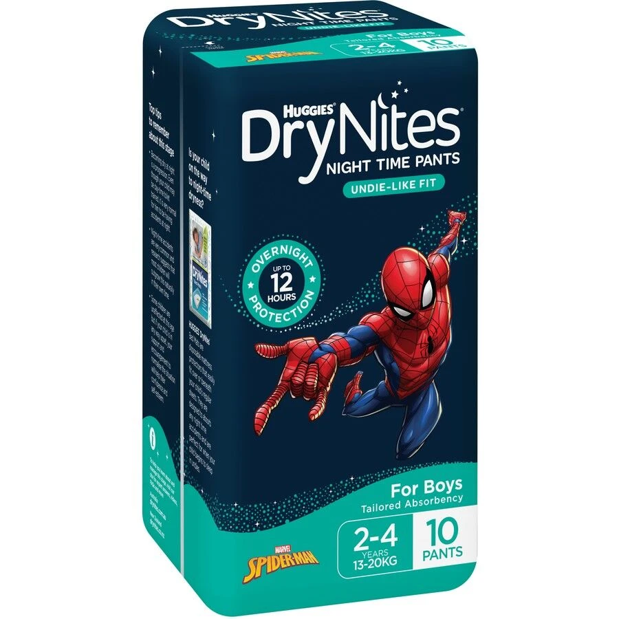 Give your little boy the confidence he deserves with Huggies DryNites Night Time Pants.Designed specifically for boys aged 2-4 years, these pants offer discreet and reliable overnight protection.Key Benefits:Discreet Protection: Look and feel like real underwear, helping to protect your child’s self-esteem. Superior Comfort: Trim fit and internal waistband for a comfortable and secure fit. Long-Lasting Protection: Up to 12 hours of leak-free protection for uninterrupted sleep. Effective Absorption: Lock Leak System draws and locks away moisture for a dry night’s sleep. This bulk pack of 30 pants provides excellent value for parents, ensuring you’re always prepared for nighttime adventures.Ideal for:Boys aged 2-4 yearsParents seeking discreet and effective nighttime protectionThose looking for a bulk pack for cost-effective convenienceExperience the Huggies DryNites difference and give your child the gift of confidence and restful sleep.