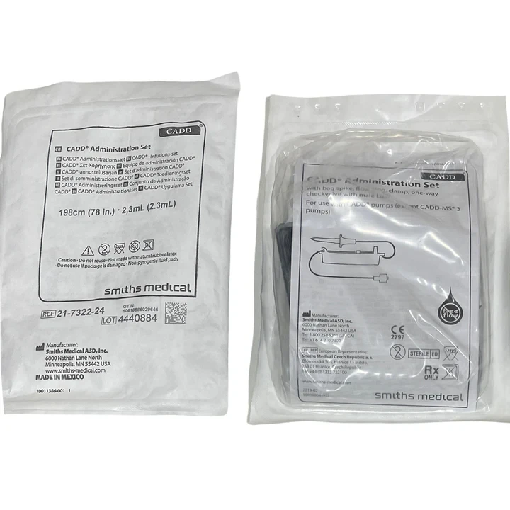 FeaturesFor CADD-Legacy®, CADD®-Solis model 2100 (all versions) model 2110 v1.0 and v2.0 pumps, and CADD®-Solis VIP model 2120 pumps125 mL/hr to 250mL/hr Depending on PumpFlow Stop, ClampMcKesson #950424Manufacturer #21-7322-24BrandCADD®ManufacturerSmiths Medical ASD IncCountry of OriginUnknownAdministration MethodPumpApplicationIV Pump SetBack Check ValveBack Check ValveConnection TypeRotating Luer Lock ConnectorDEHP IndicatorDEHP-Free TubingDrip Rate125 – 250 mL / Hr Drip RateFilterWithout FilterFlow Control TypePinch ClampFor Use WithFor use with CADD-Solis™, CADD-Legacy® and CADD-Prizm® PumpsInjection Port Type GroupingWithout PortNumber of PortsWithout PortsPort TypeWithout PortPriming Volume2.3 mL Priming VolumeSpike TypeUniversal SpikeSterilitySterile Fluid PathTubing Length78 Inch TubingTubing Length Range73 to 96 InchesTypeSolutionUNSPSC Code42221609