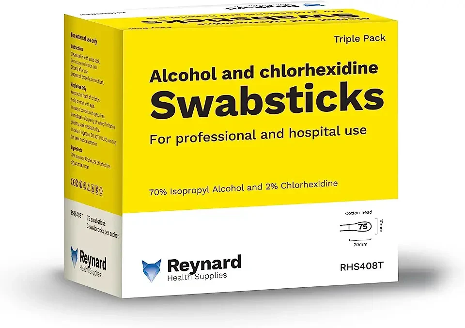 A wetted cotton head adhered to a 10cm plastic stick which is used to sanitise the skin. Each swab stick is impregnated with a clear solution of 2% Chlorhexidine digluconate & 70% Isopropyl alcohol. Each sachet contains 3 swabsticks.The Reynard 70% Alcohol 2% Chlorhexidine Antiseptic Cotton Swabstick is a must-have item in any first aid kit or healthcare facility. This innovative triple pack product ensures cleanliness and hygiene when it comes to skin sanitization.Each swabstick is designed with a wetted cotton head that is specifically adhered to a 10cm plastic stick. This efficient design allows for a targeted application of the antiseptic solution to the desired areas. The cotton head is soft and gentle on the skin, preventing any discomfort or irritation that may arise during use.What sets this product apart is the powerful combination of 2% Chlorhexidine digluconate and 70% Isopropyl alcohol in the clear solution. Chlorhexidine digluconate is a well-known antiseptic with broad-spectrum activity against a wide range of microorganisms. It effectively kills bacteria, viruses, and fungi, preventing the spread of germs and reducing the risk of infections. Isopropyl alcohol, on the other hand, acts as a disinfectant by denaturing proteins and disrupting the cell membranes of microorganisms.These active ingredients work in synergy to provide a highly effective solution that maintains optimal levels of hygiene. The 2% Chlorhexidine digluconate and 70% Isopropyl alcohol ensure a thorough sanitization of the skin, making it suitable for a variety of applications, from wound cleansing to pre-injection site preparation.The Reynard 70% Alcohol 2% Chlorhexidine Antiseptic Cotton Swabstick comes in a box of 75, conveniently divided into sachets containing 3 swabsticks each. This packaging allows for easy storage and accessibility. The white color of the swabstick also adds a sense of cleanliness and professionalism to any medical environment.Overall, this triple pack product offers a reliable and convenient solution for maintaining proper hygiene and sanitization. The Reynard 70% Alcohol 2% Chlorhexidine Antiseptic Cotton Swabstick is an essential tool for healthcare professionals, caregivers, and individuals who prioritize cleanliness and want to ensure the highest level of hygiene.